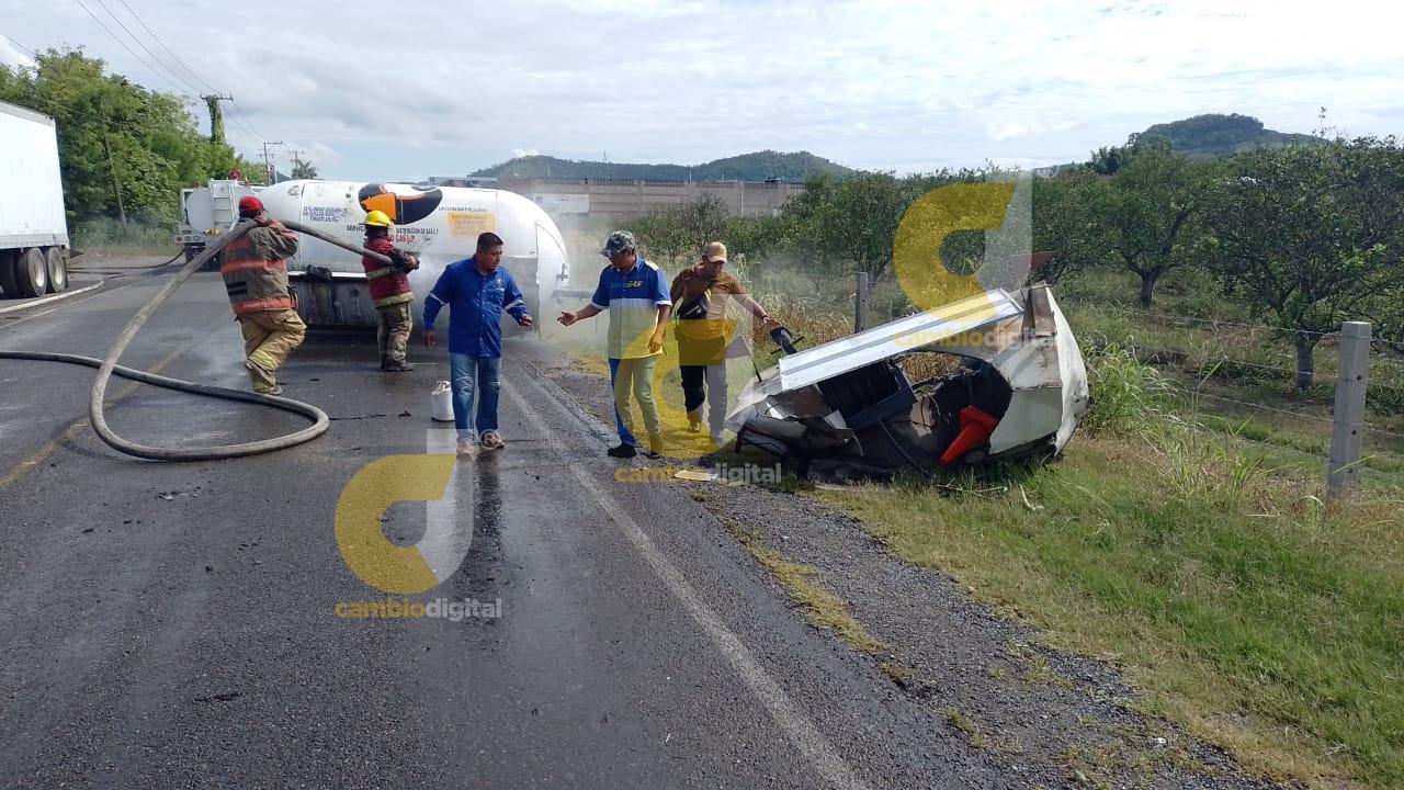 Mientras que en la carpeta asfáltica quedó a la mitad de la vía de comunicación, el contenedor de color blanco con la razón social de Gas Fast, presentado una fuga del peligroso combustible.