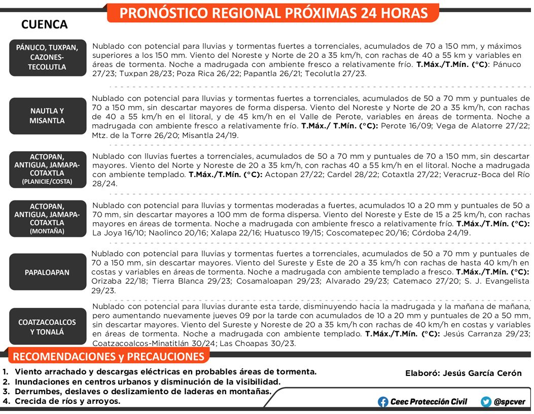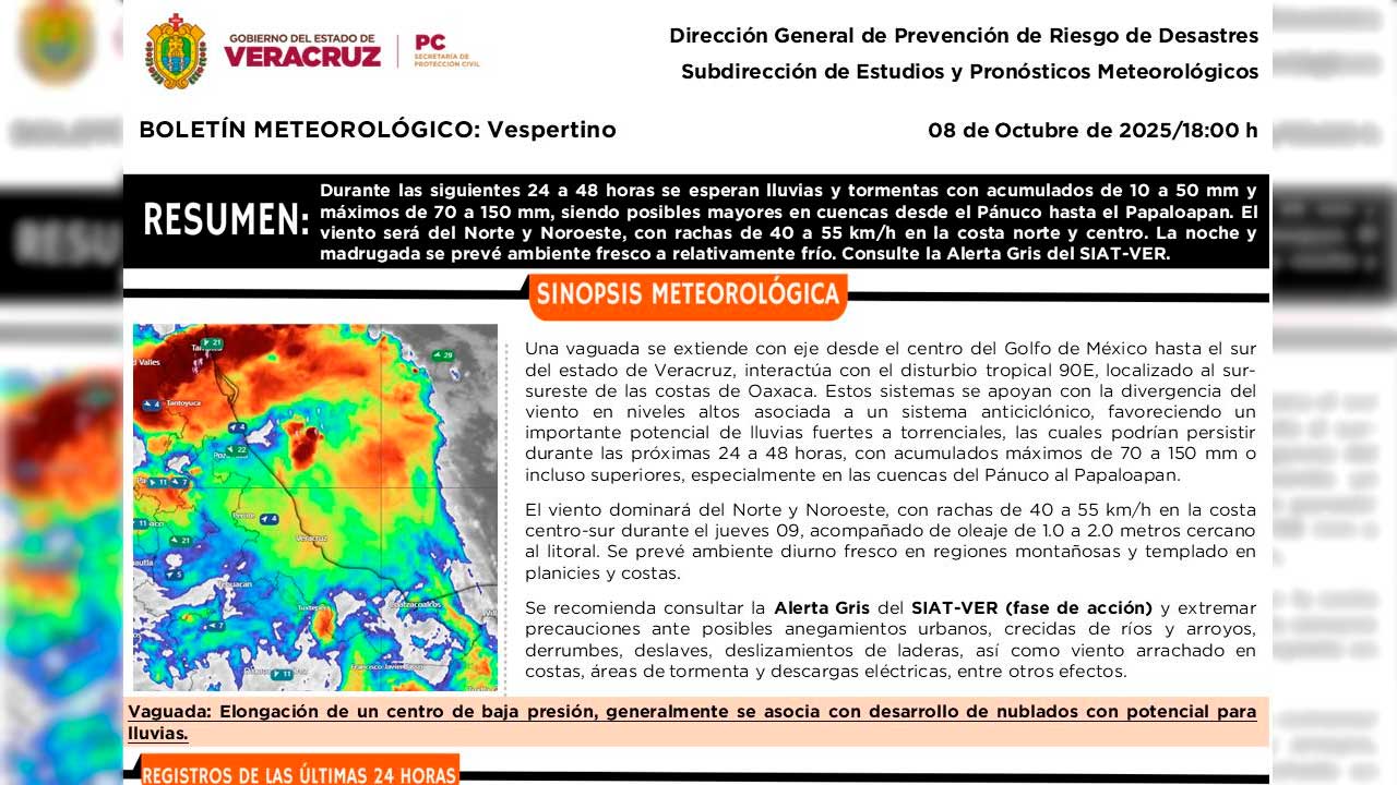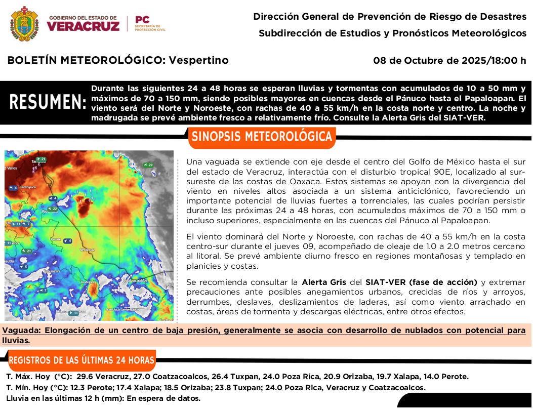 Durante las siguientes 24 a 48 horas se esperan lluvias y tormentas con acumulados de 10 a 50 mm y máximos de 70 a 150 mm, siendo posibles mayores en cuencas desde el Pánuco hasta el Papaloapan. El viento será del Norte y Noroeste, con rachas de 40 a 55 km/h en la costa norte y centro. La noche y madrugada se prevé ambiente fresco a relativamente frío. Consulte la #AlertaGris del #SIATVER.