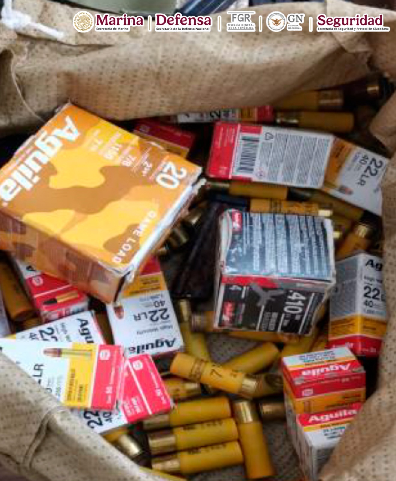 En los inmuebles se aseguraron cuatro armas largas, 166 cartuchos, seis granadas, 39 vehículos, nueve tractocamiones, seis camiones de volteo, dos pipas, dos remolques, dos retroexcavadoras, una camioneta tipo redilas y cinco motocicletas; además de una contadora de billetes, cámaras fotográficas y de video, 17 teléfonos celulares, dinero en efectivo y otros equipos electrónicos.