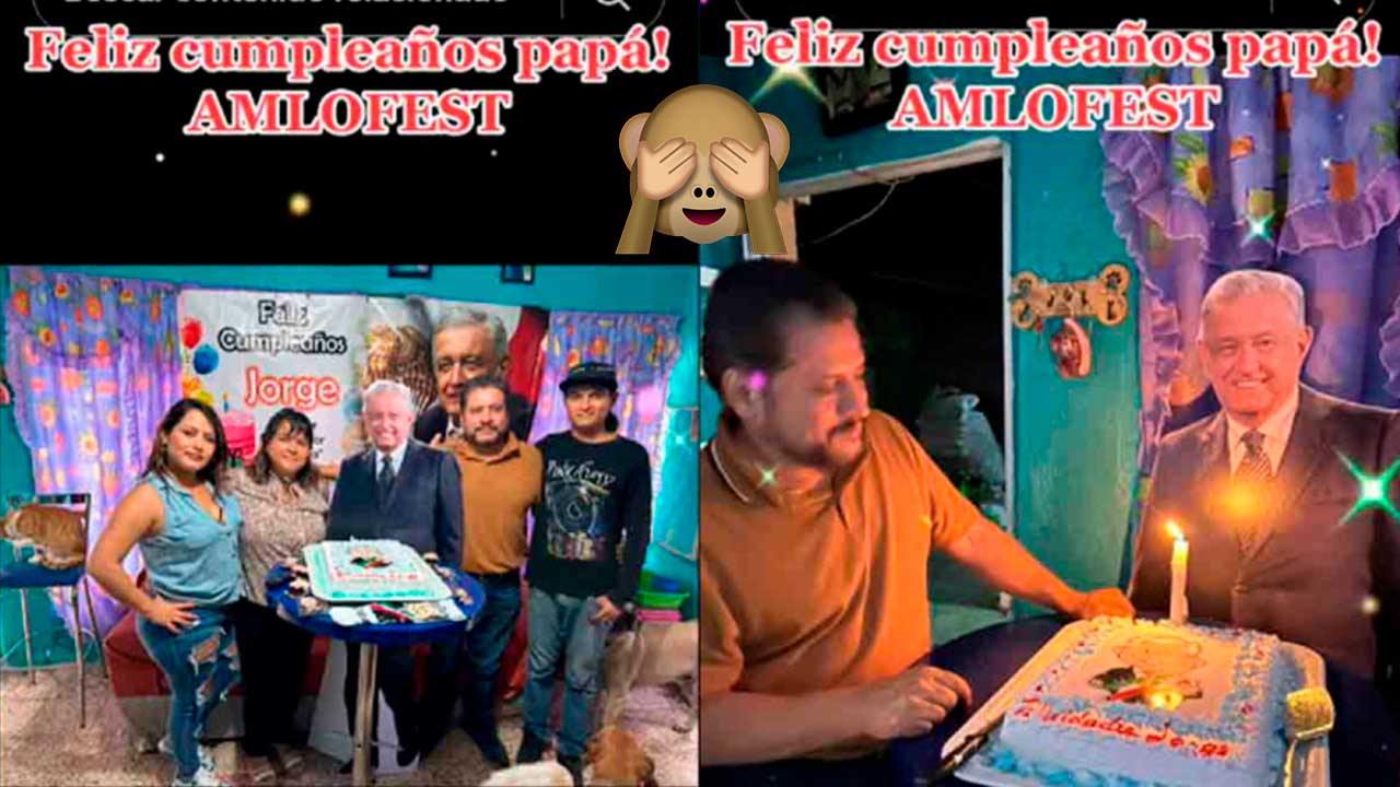 * A través de TikTok fue compartido el clip en donde se observa el festejo del hombre que incluyó Amlitos, un pastel con la imagen del mandatario, una lona con la leyenda “Amor con amor se paga"