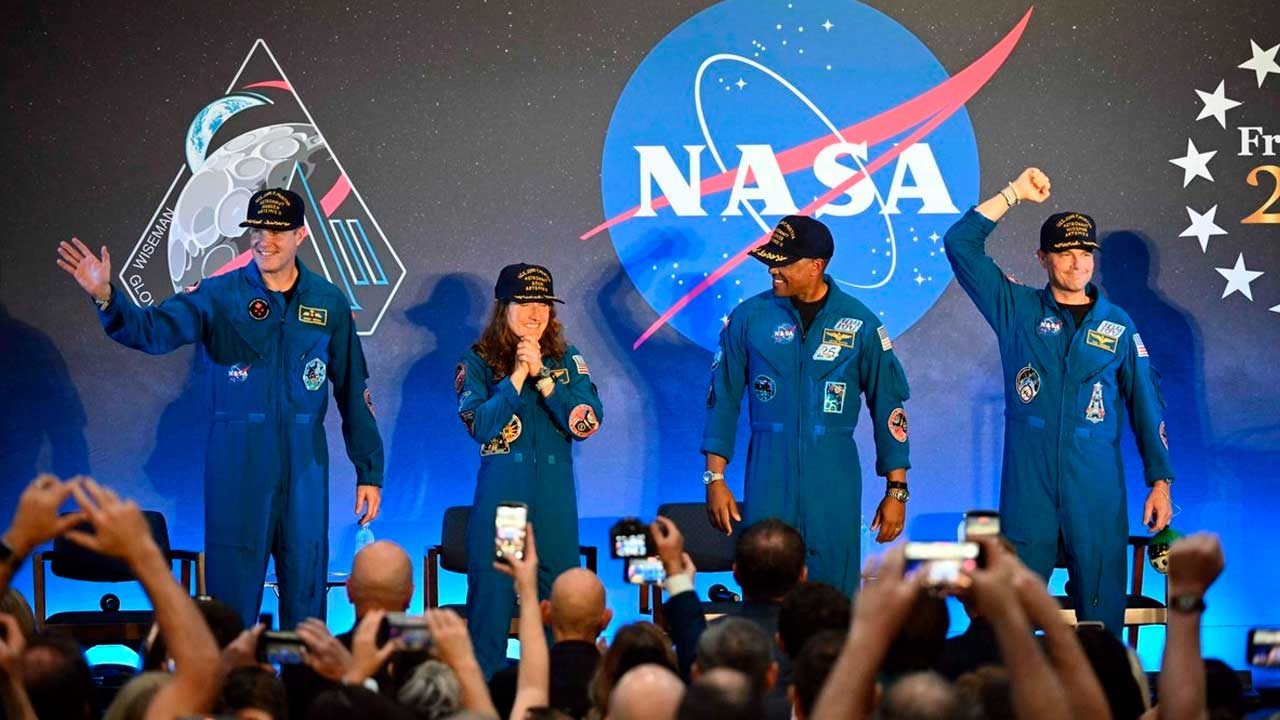 Tras un breve rencuentro con sus cónyuges e hijos, el comandante Reid Wiseman, el piloto Victor Glover, Christina Koch y el canadiense Jeremy Hansen subieron al escenario del hangar rodeados de trabajadores del centro espacial y otros invitados. Fueron presentados por el administrador de la NASA, Jared Isaacman, uno de los primeros en saludarlos a bordo del barco de recuperación el pasado viernes.