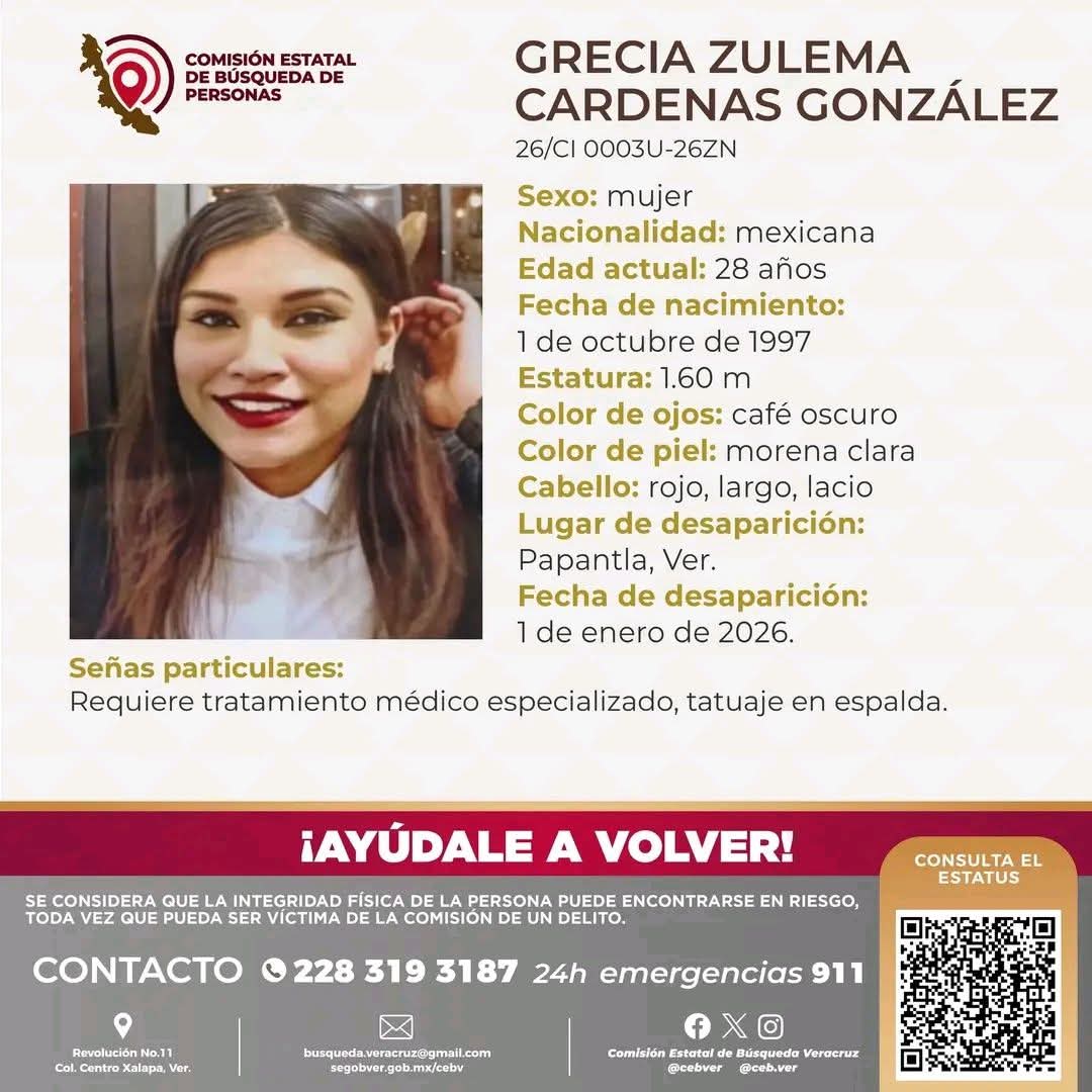 Papantla, Ver.- Continúa la angustia por parte de amigos y familiares de la jovencita Grecia Zulema Cárdenas González, de 28 años, reportada como desaparecida desde el 1 de enero de 2026 en este municipio papanteco.