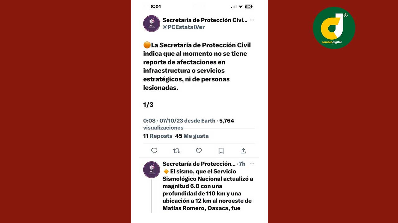 El sismo que el Servicio Sismológico Nacional actualizó a magnitud 6.0 con una profundidad de 110 km y una ubicación a 12 km al noroeste de Matías Romero, Oaxaca, no dejó afectaciones o incidentes que fueran reportados, informó la Secretaría de Protección Civil estatal.