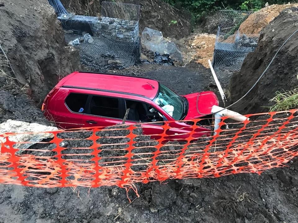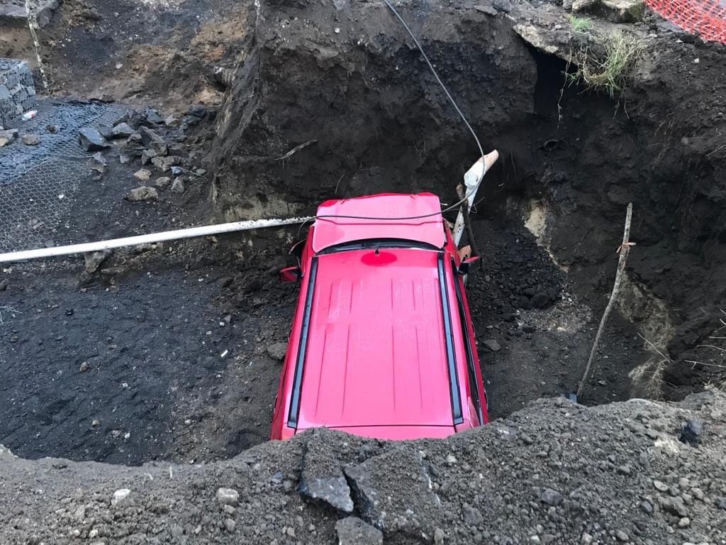 Cuando el vehículo transitaba en el camino donde se realizan obras, sin señalamientos preventivos, cayó al fondo del hoyo que se formó por las lluvias.