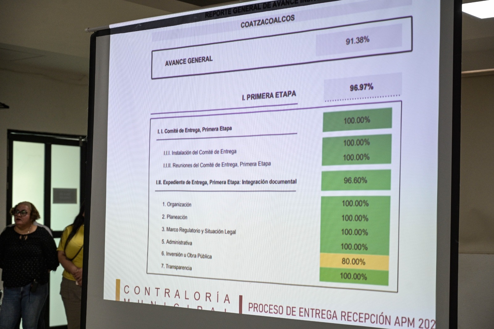 Cruz Malpica informó que el programa de entrega-recepción registra actualmente un 91 por ciento de avance, el cual se elevará al 97 por ciento tras esta reunión. Calificó el acto como fundamental, pues refleja el orden y el cumplimiento de la Ley por parte de todos los involucrados.