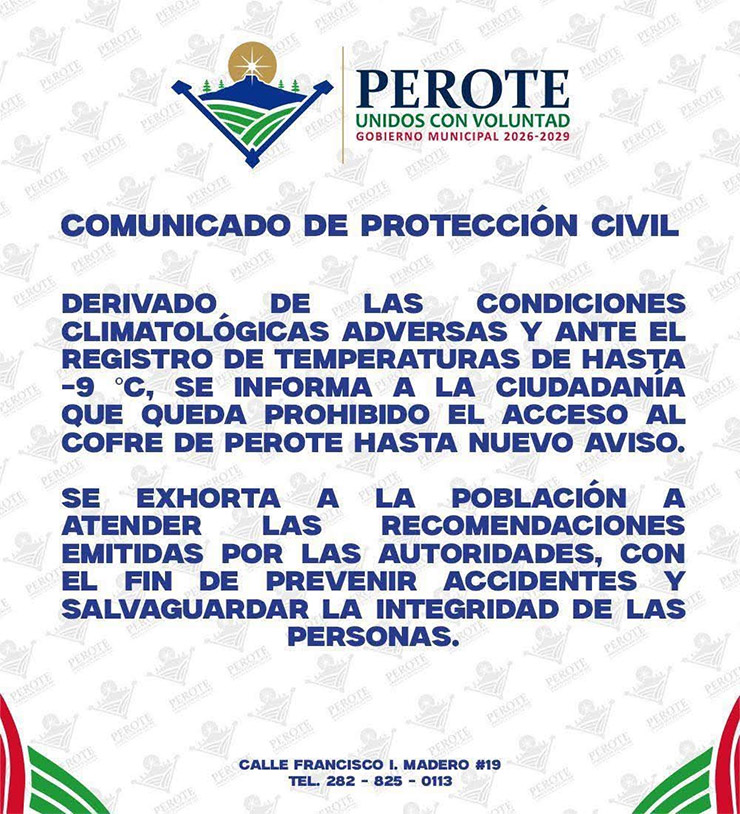 El Ayuntamiento de Perote informó el cierre de los accesos al Cofre de Perote, debido a temperaturas de hasta -12 grados, luego de la nevada registrada durante la madrugada y la aguanieve por la mañana.