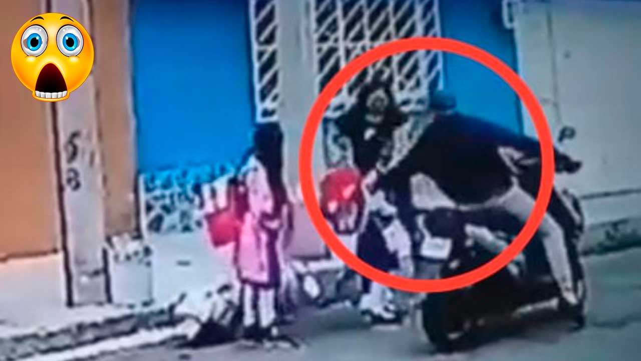 En las imágenes se observa cómo una mujer va caminando por la calle con tres niñas, que llevan puestos uniformes de escuela. Mientras avanzan, un sujeto se acerca a ellas a bordo de una motocicleta.