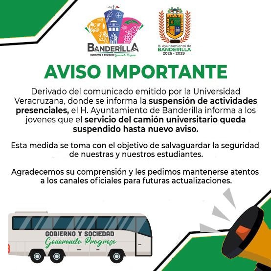 Banderilla, Ver.- Derivado del comunicado emitido por la Universidad Veracruzana, donde se informa la suspensión de actividades presenciales, el H. Ayuntamiento de Banderilla informa a los jóvenes que el servicio del camión universitario queda suspendido hasta nuevo aviso.