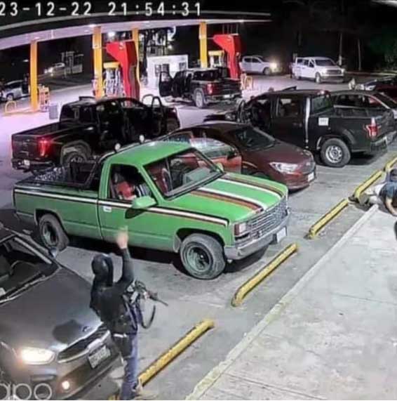 También puede apreciarse la presencia de grupos fuertemente armados, frente a una gasolinera, captados por la cámara de seguridad de una tienda de conveniencia en la que se aprecia a los presuntos criminales teniendo en el suelo a los clientes y vigilando la zona.