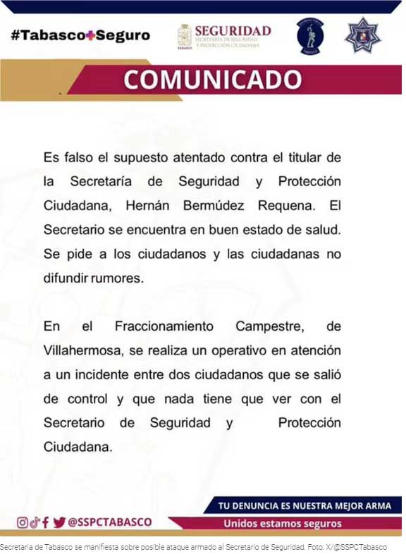 Previamente a los hechos difundidos mediante imágenes posteadas de diferentes medios locales del Estado y residentes cercanos a las zonas de violencia, todo esto inicio tras reportarse una balacera en el Fraccionamiento campestre el cuál atribuyeron a un supuesto atentado hacia el Secretario de Seguridad Ciudadana del Estado de Tabasco, Hernán Bermúdez Raquena a quién reportan en un comunicado de la Secretaria de Seguridad Ciudadana del Estado, no estuvo en ningún incidente de violencia y goza de buen estado de salud, por lo que solicitaron de la manera más respetuosa no difundir rumores que alerten a la ciudadanía.