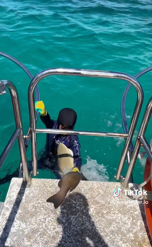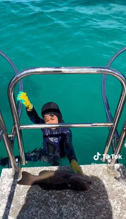 En el material, compartido en la cuenta de Tiktok Huntmaster, se ve al niño salir del mar con un traje de neopreno y un enorme pez en la mano, con el fin de presumir a sus familiares que lo acompañaban.