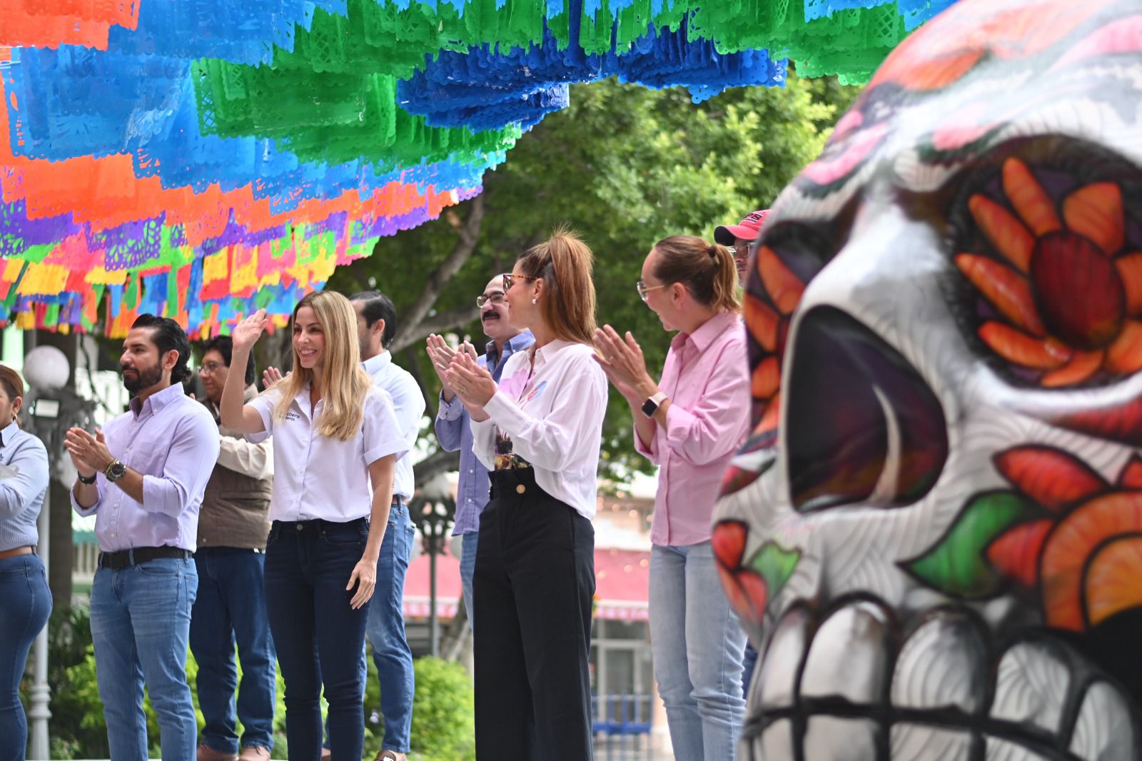 “Es una fiesta muy importante para todos los mexicanos celebrar a nuestros fieles difuntos, es una fiesta que nos da identidad, y nosotros ya empezamos con la decoración de nuestro Zócalo, es una decoración muy bonita con una calavera gigante, unas catrinas y un colorido tapete aéreo de papel picado alusivo a estos festejos”; dijo.