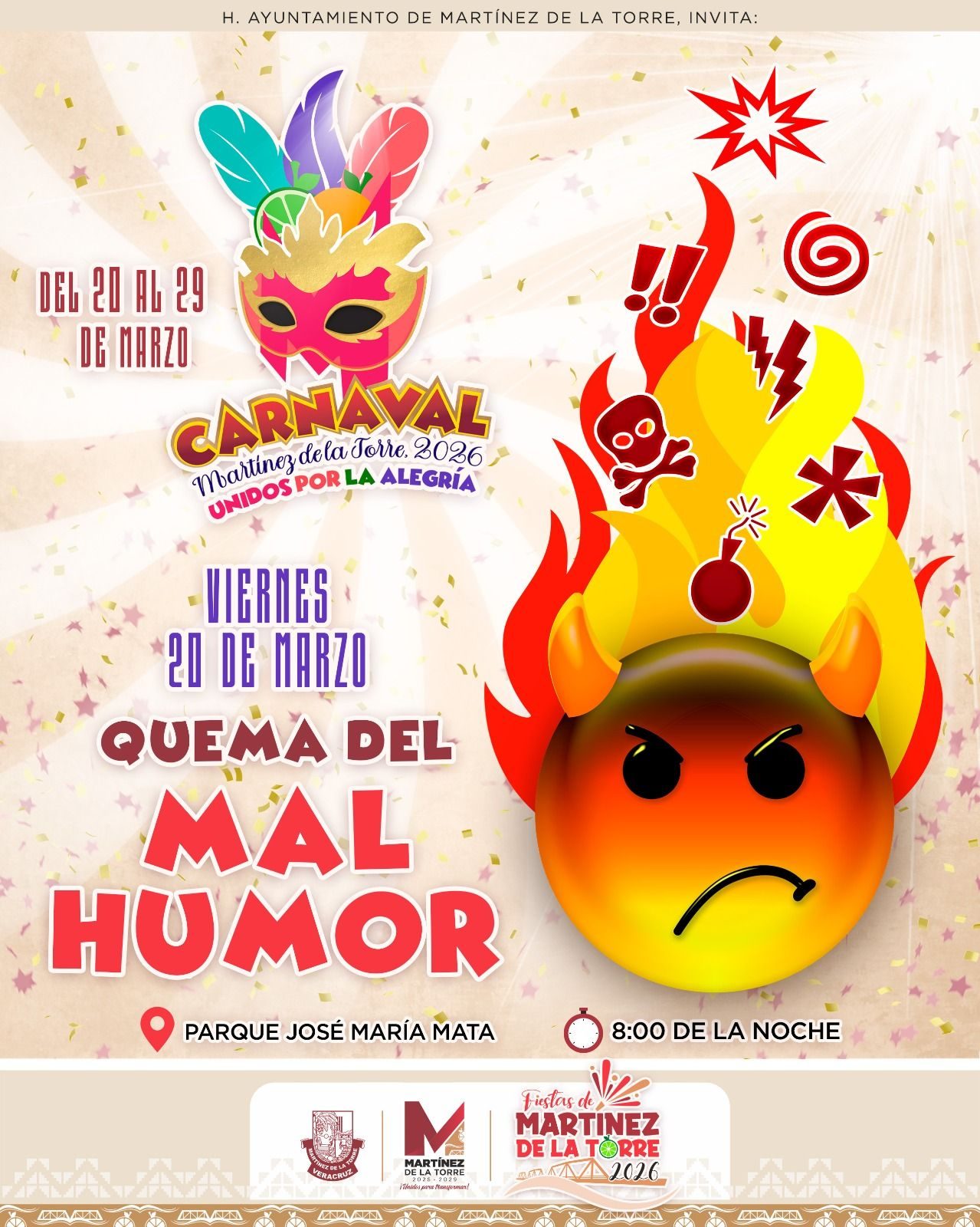 Martínez de la Torre, Ver.- El alcalde Modesto Velázquez Toral y el H. Ayuntamiento de Martínez de la Torre invitan a la ciudadanía a disfrutar de la tradicional “Quema del Mal Humor”, evento que marca el inicio del Carnaval Martínez de la Torre 2026 “Unidos por la Alegría”.