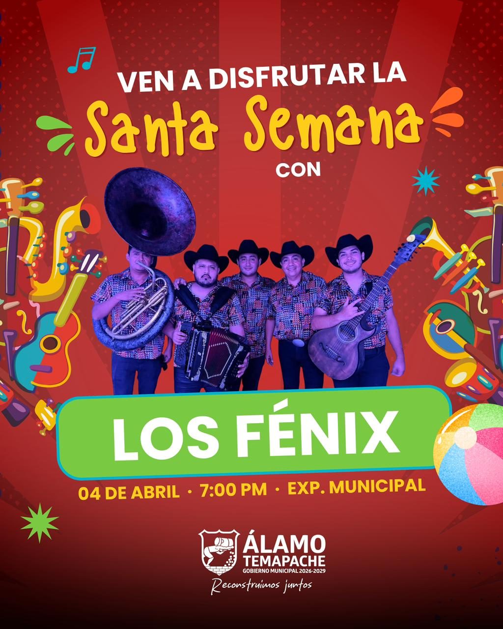 La fiesta musical iniciará esta noche a partir de las 19:00 horas en la explanada municipal, con la participación de la agrupación Los Fénix que pondrá a bailar a todos en sábado de gloria al ritmo de sus notas norteñas.