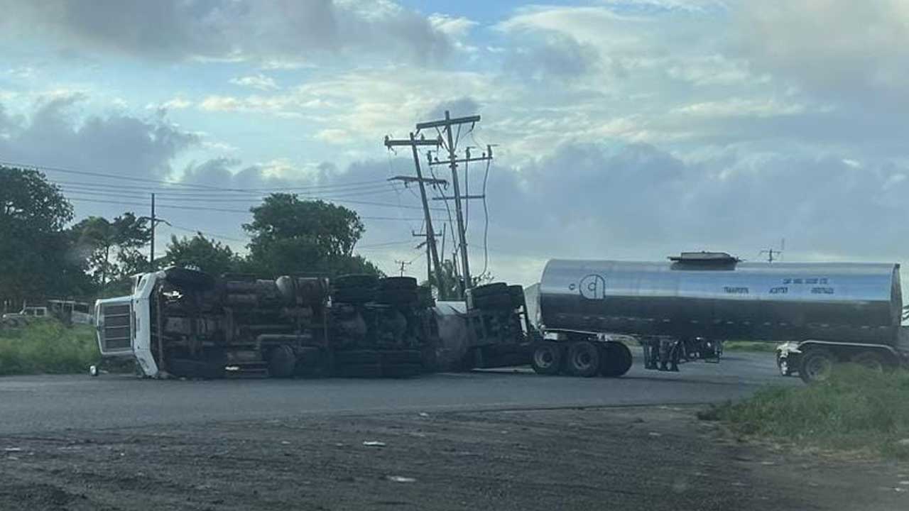 Veracruz, Ver.- Este martes se registra la volcadura de un tractocamión sobre la carretera federal puerto de Veracruz-Xalapa a la altura del crucero de Santa Fe.