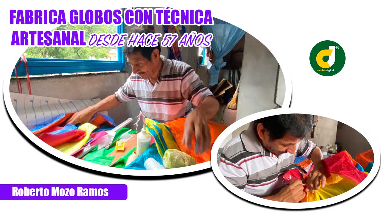 Roberto Mozo Ramos, fabrica globos con técnica artesanal desde hace 57 años y en entrevista explicó lo que aprendió de su padre y él ha enseñado a sus hijos, para elaborar figuras tradicionales como los trompos y las ilamas, de las que ha hecho con 480 picos y más de 15 metros de altura.