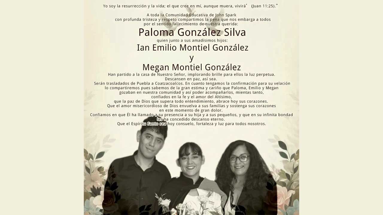 Coatzacoalcos, Ver.- Una tragedia conmociona a Coatzacoalcos: Paloma González Silva, maestra de la escuela privada "John Spark", y sus hijos Ian Emilio y Megan Montiel González fallecieron en San Andrés Cholula, Puebla, mientras estaban de vacaciones.
