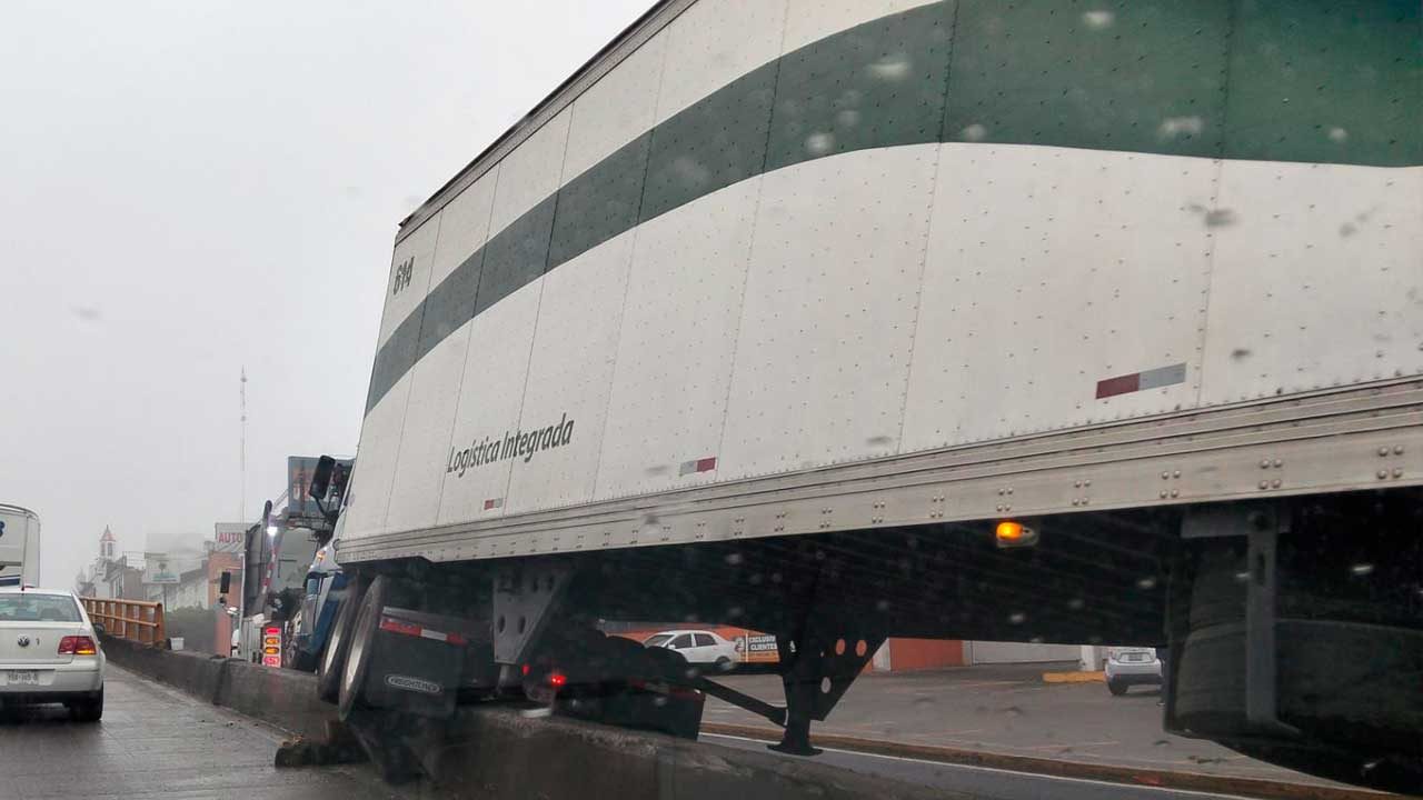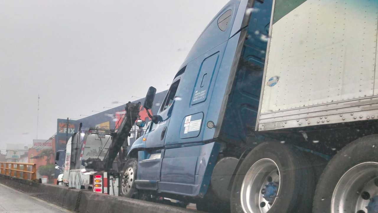 La unidad de carga casi se volcó al quedar atorado en el barandal sobre la carretera federal 140.