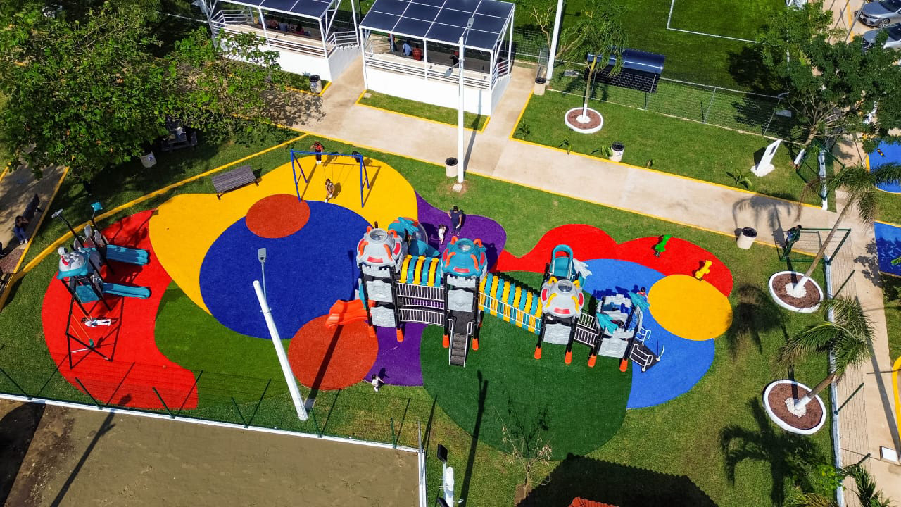 Además, se construyeron siete gradas techadas con estructura metálica y policarbonato, se realizó la instalación eléctrica para iluminación exterior e interior, estacionamientos de concreto, colocación de juegos infantiles, ejercitadores y la rehabilitación integral de los baños.