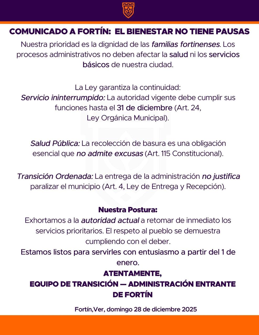 Fortín, Veracruz.- El alcalde electo de Fortín, Alfonso “Piccolo” Marín Delfín, afirmó que los procesos administrativos de transición no deben afectar la salud ni los servicios básicos de la población, al emitir un comunicado dirigido a la ciudadanía.
