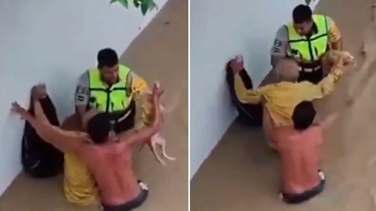 Momentos después, un oficial de la Guardia Nacional se acerca para ayudar en las labores de rescate y tomar a uno de los perritos, que era transportado por el hombre mayor.