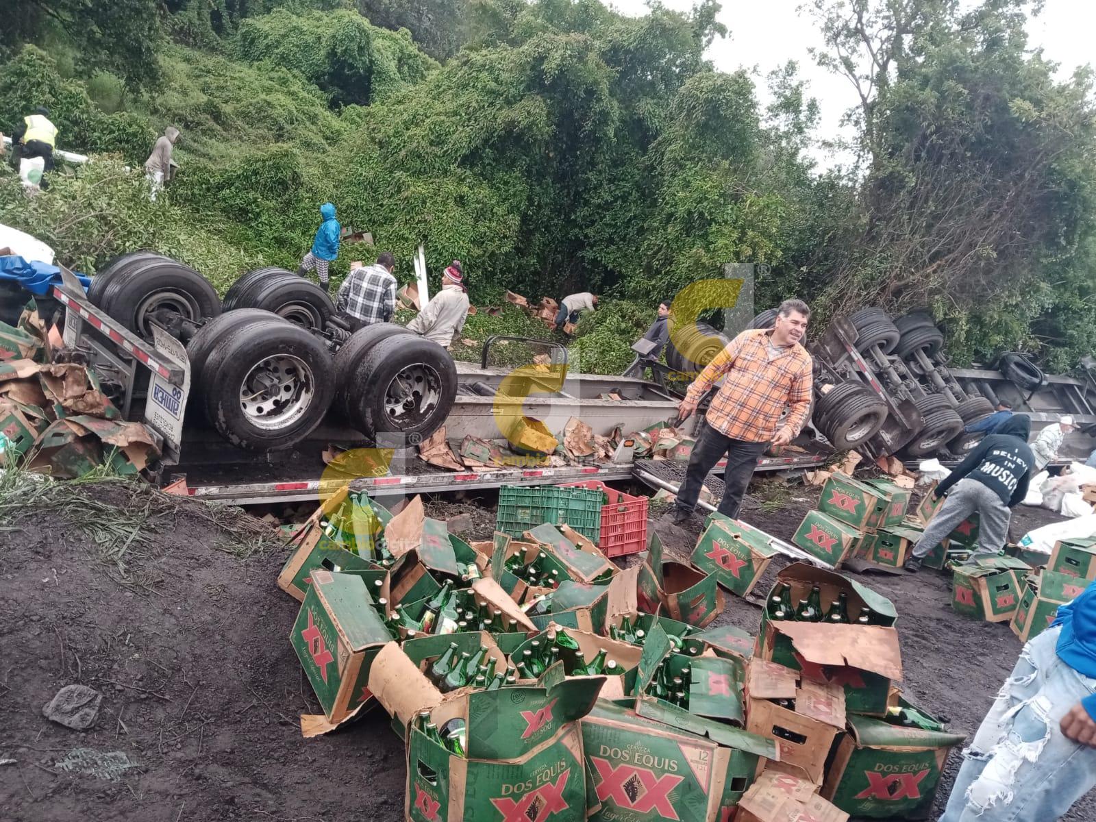Tras volcarse, rapiñan tráiler cargado de cervezas en Nautla