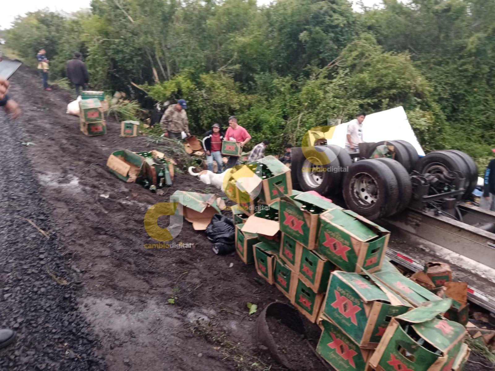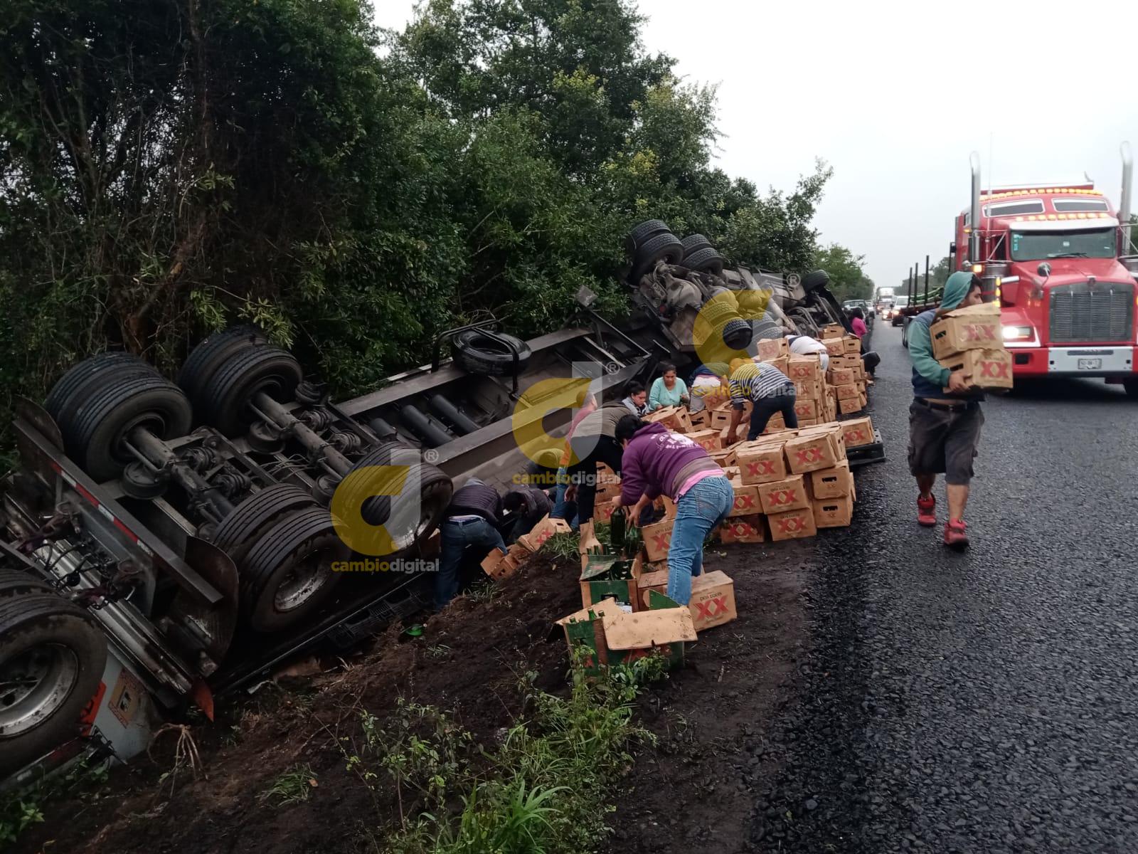 Nautla, Ver.- Un aparatoso percance se suscitó sobre la carretera federal 2080 Poza Rica a Cardel en su tramo Nautla a Vega de Alatorre donde un tráiler cargado de cervezas quedó volcado en dicha vía de comunicación.