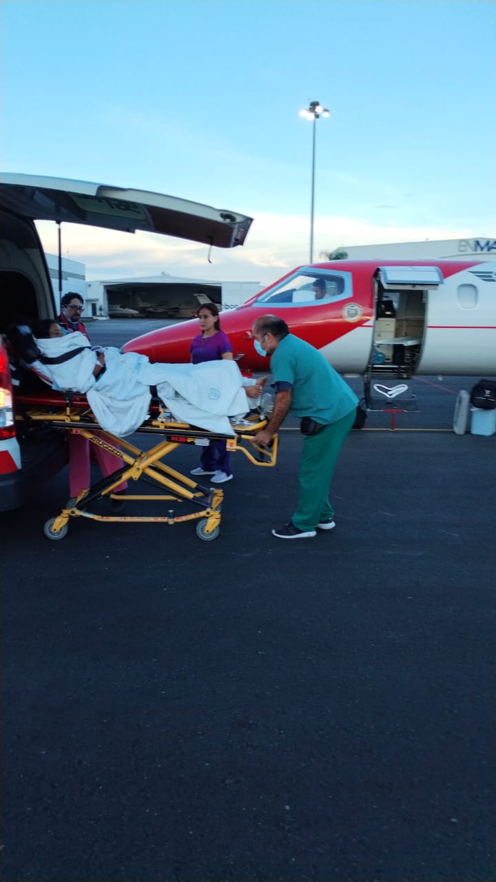 La pequeña fue trasladada a bordo de la ambulancia aérea con matrícula XA-DOC, luego de que a causa del dengue sufrió un “choque”, es decir una afección en la que el flujo sanguíneo a los órganos es bajo, lo que disminuye el suministro de oxígeno y puede ocasionar daños en los órganos.