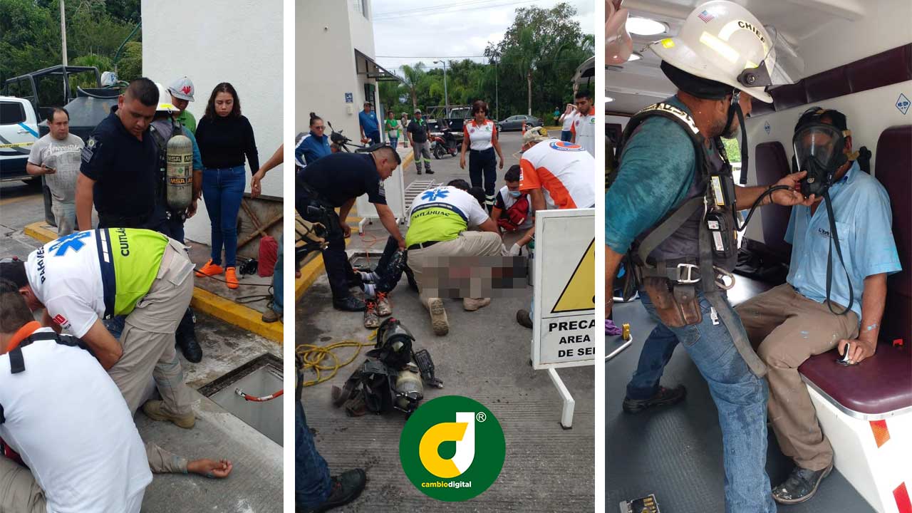 Bomberos de Cuitláhuac lograron rescatar a los pintores quienes se sintieron mal y se desmayaron dentro de la cisterna.