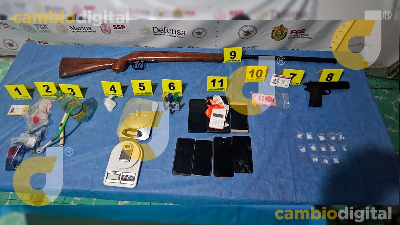 En el lugar, elementos de la Policía Ministerial, en coordinación con el Ejército Mexicano y la Secretaría de Seguridad Pública del Estado, aseguraron dos armas, presuntas sustancias ilícitas, equipos de radiocomunicación, teléfonos celulares y diversos objetos.