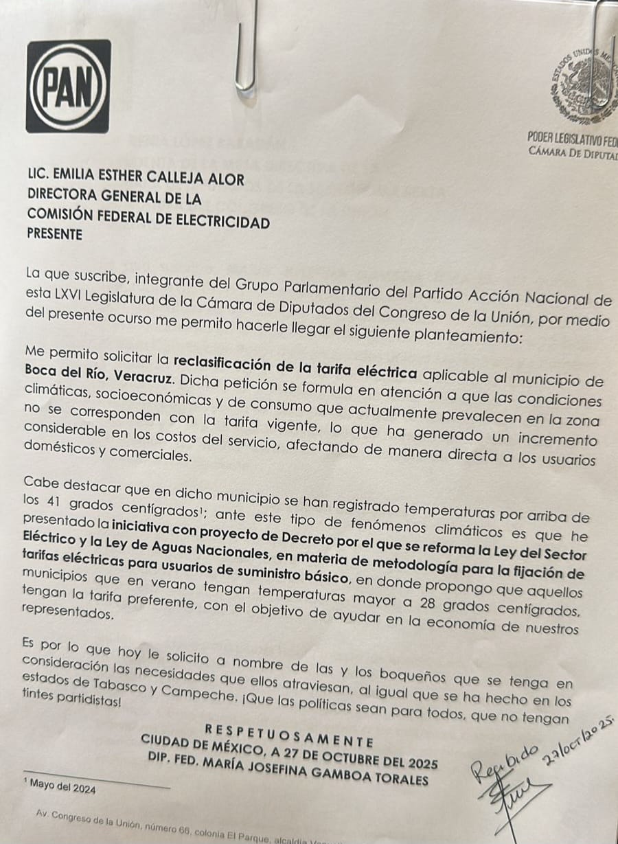 Ciudad de México.- En el marco de la comparecencia de la directora General de la Comisión Federal de Electricidad (CFE), Mtra. Emilia Esther Calleja Alor; la diputada federal del PAN, Maryjose Gamboa, solicitó reclasificar las tarifas de energía eléctrica en el municipio de Boca del Río, “ya que las condiciones climáticas, socioeconómicas y de consumo que actualmente prevalecen en la zona no corresponde a la tarifa vigente”, señaló.