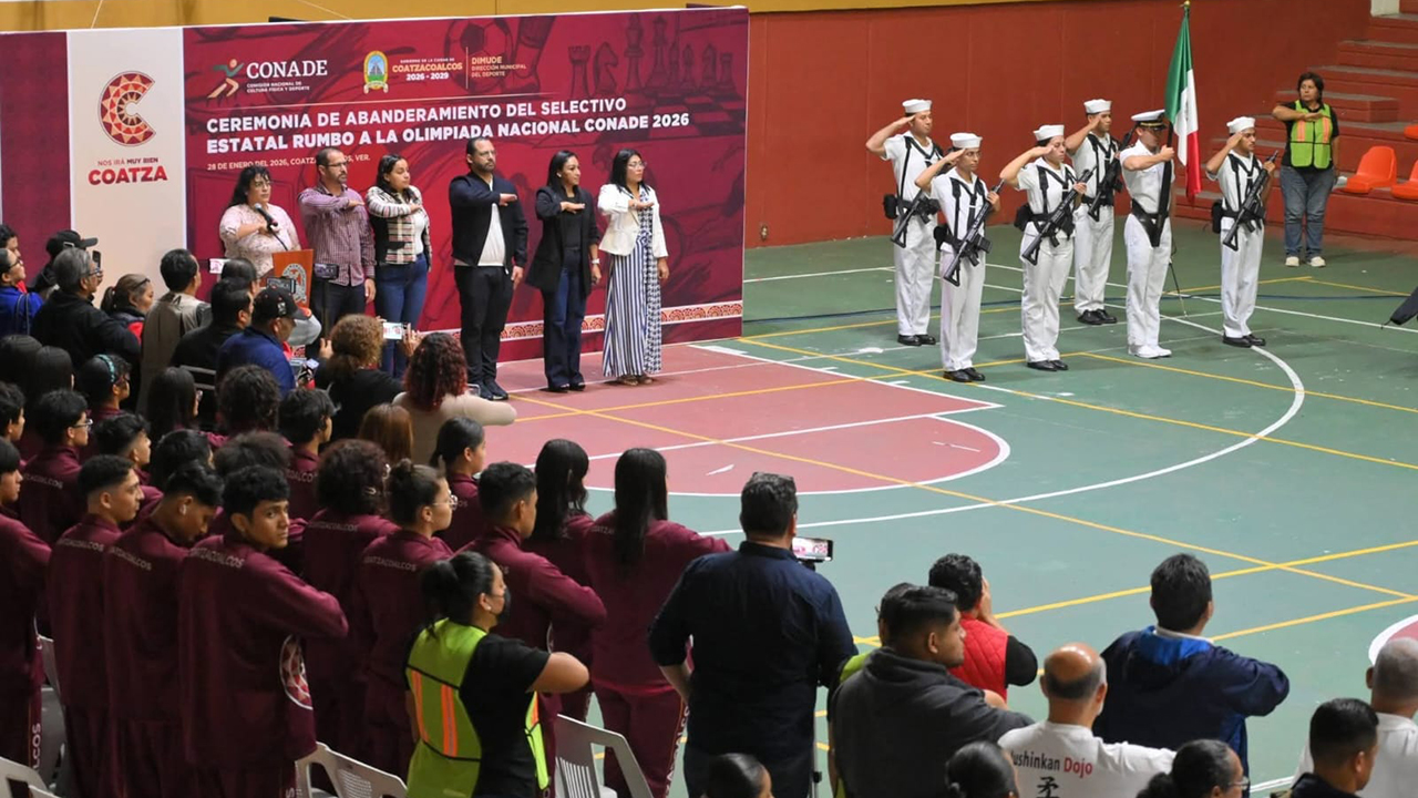 Coatzacoalcos, Ver., 28 de enero de 2026.- “Coatzacoalcos está orgulloso de ustedes”, dijo el alcalde, Pedro Miguel Rosaldo García, a los 520 deportistas locales del selectivo estatal que este día fueron abanderados por la autoridad municipal rumbo a su participación en la Olimpiada Nacional Conade 2026.