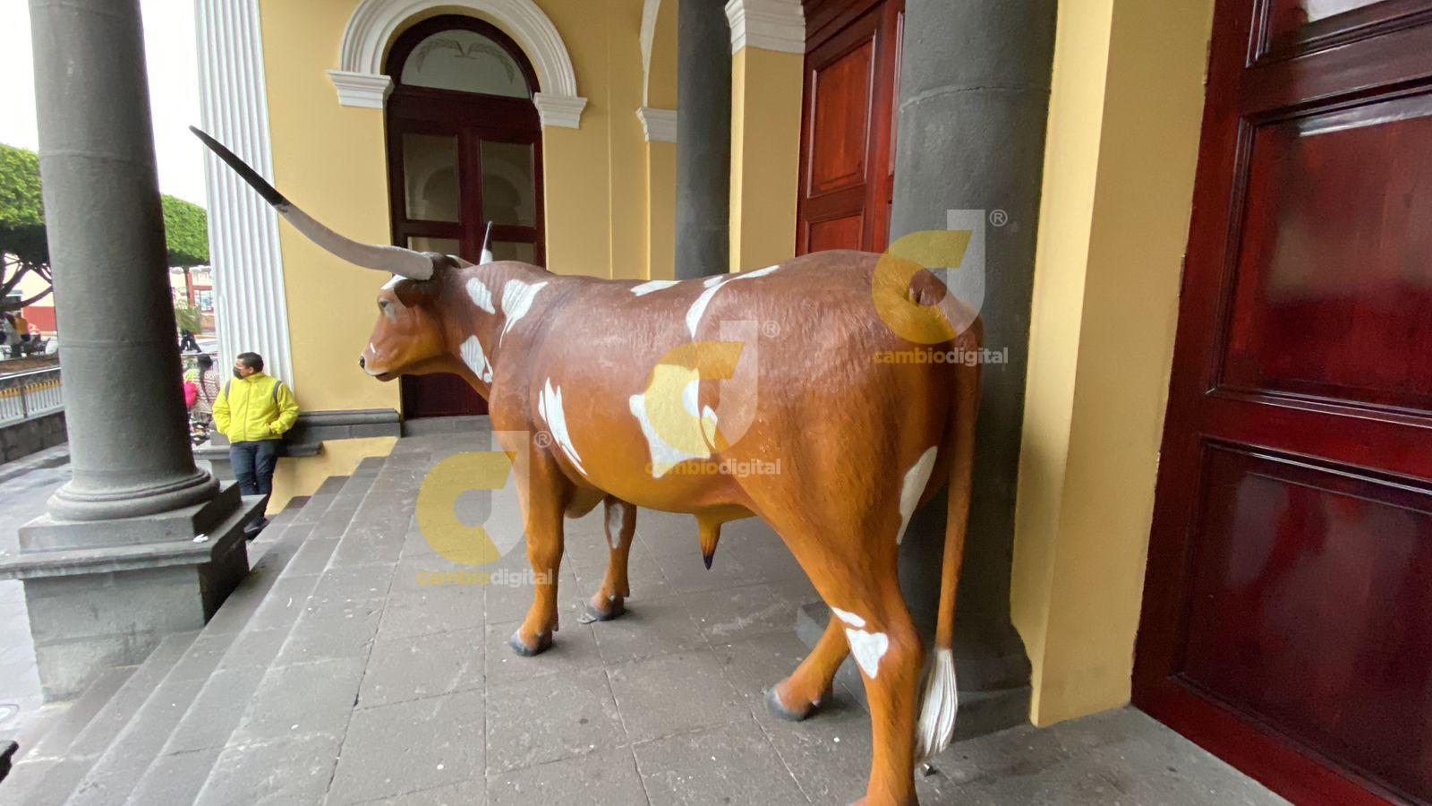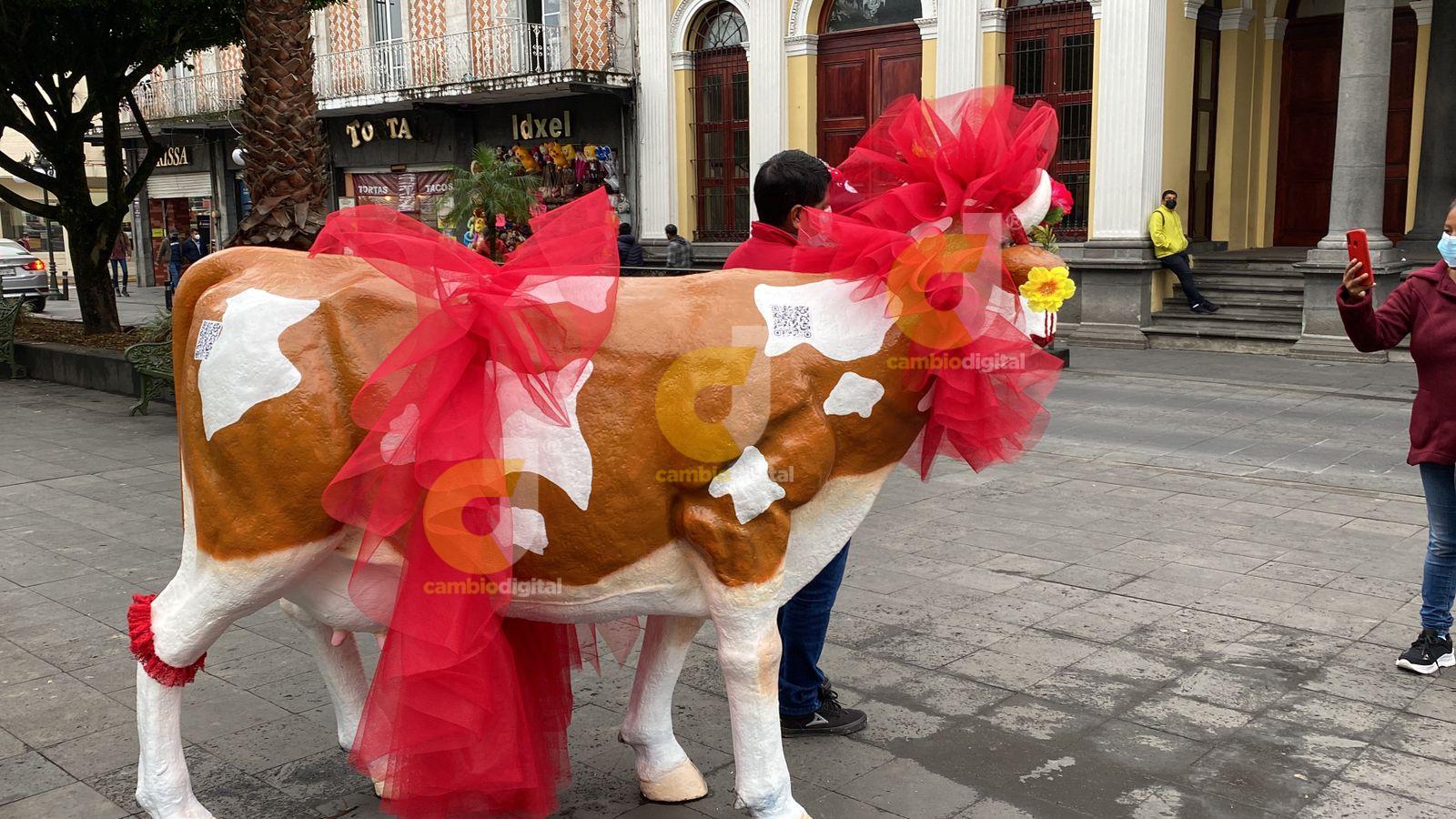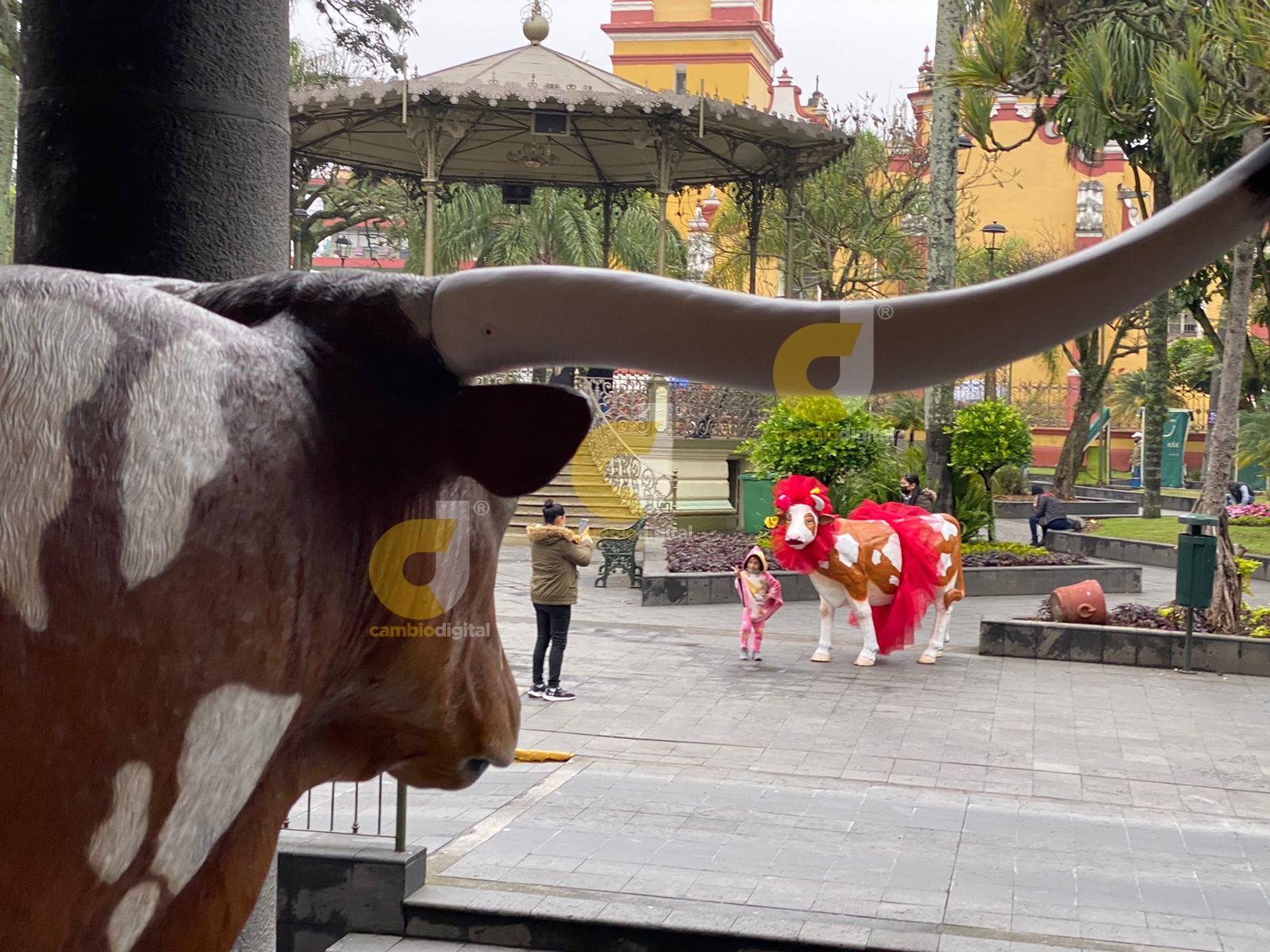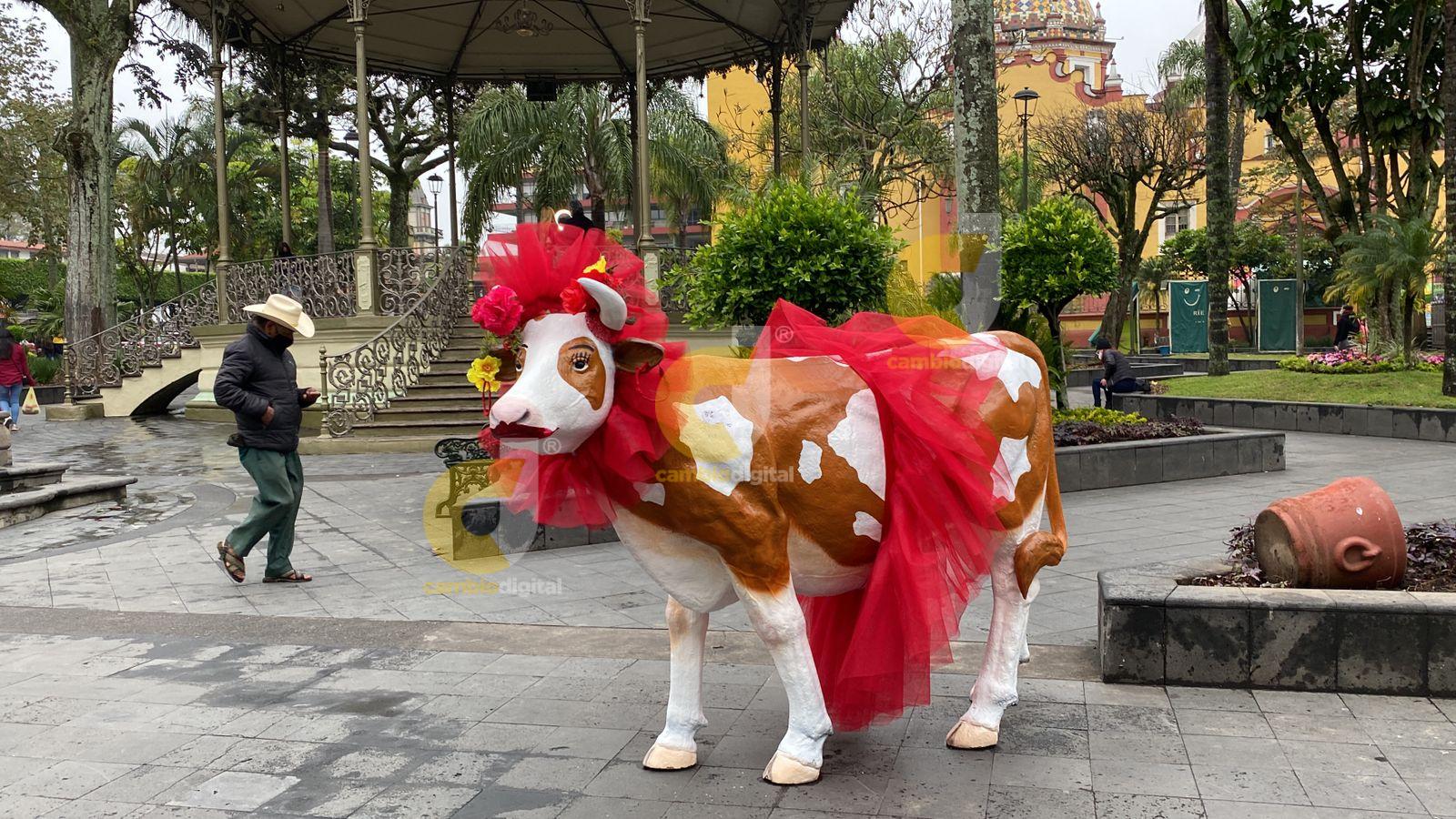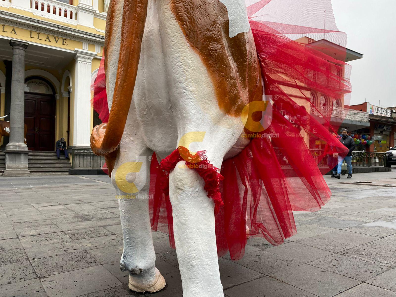 La vaca luce ya su velo, neglillé y hasta liguero rojo, y se encuentra en el parque, frente al toro apostado en el teatro Ignacio de la Llave.