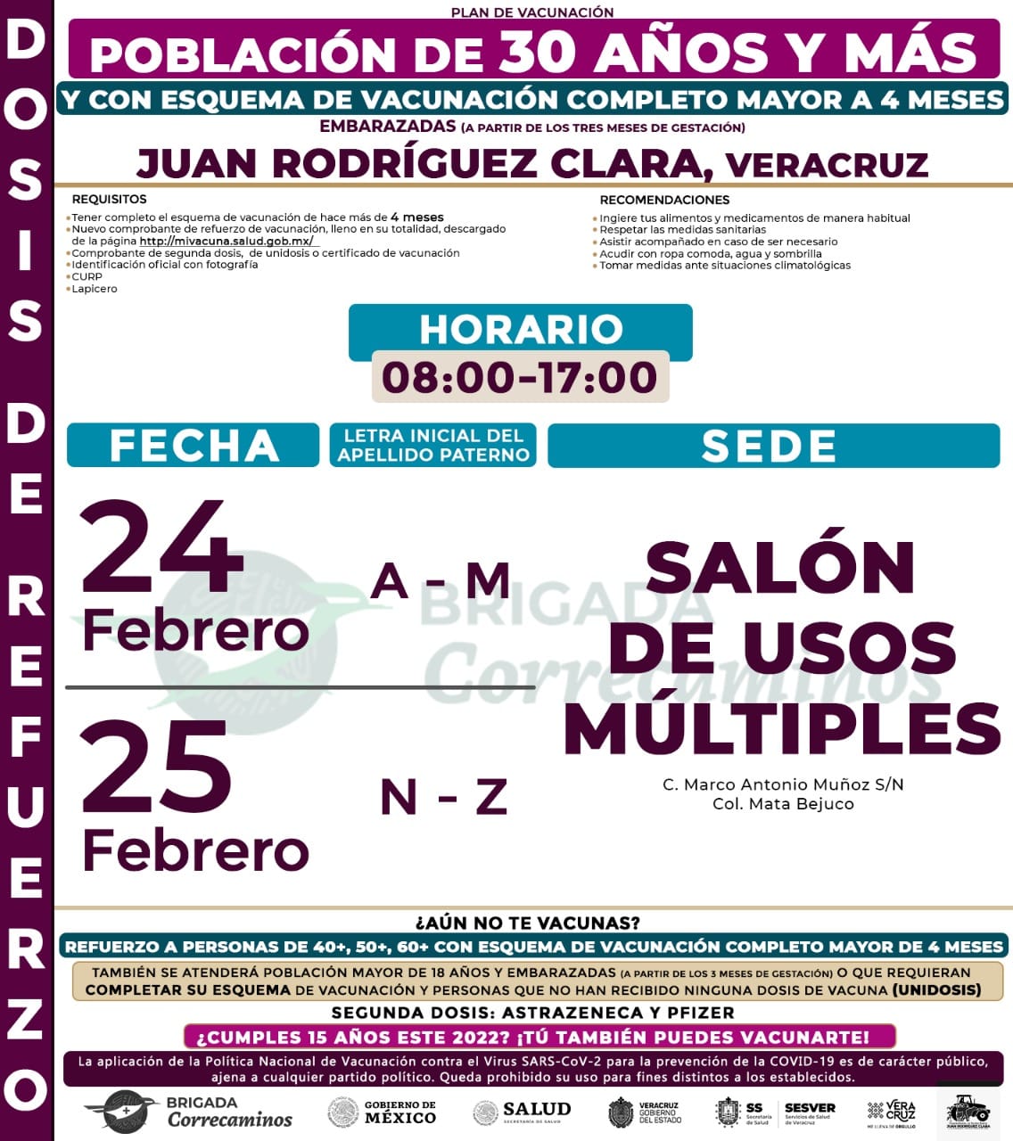 Juan Rodríguez Clara, Ver.- Aviso a la población de Juan Rodríguez Clara, vacunación contra el Covid-19 los días 24 y 25 de febrero en el salón de usos múltiples del municipio ubicado en Marco Antonio Muñoz colonia Mata Bejuco.