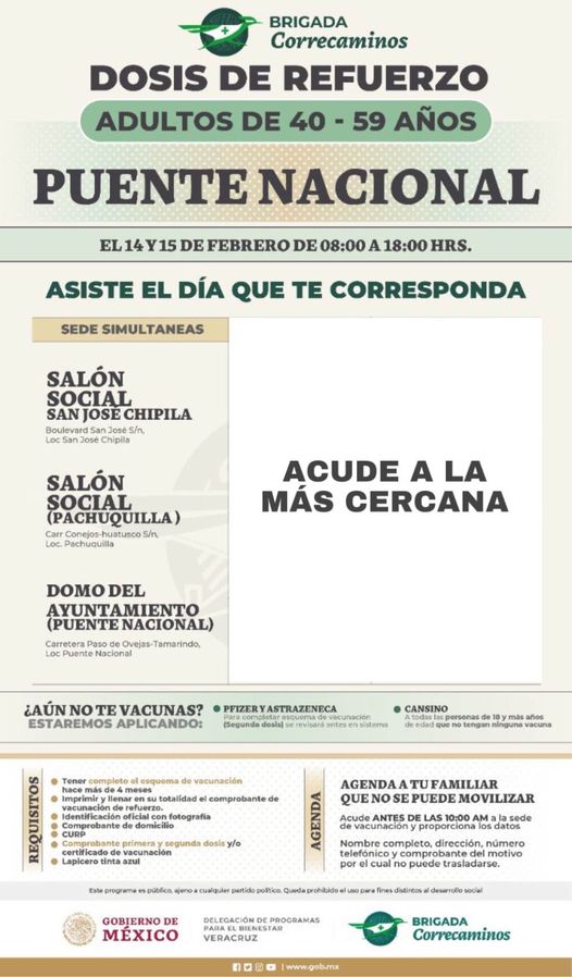 Puente Nacional, Ver.- A través de redes sociales, el ayuntamiento de Puente Nacional informa a la ciudadanía que este 14 y 15 de febrero se llevará a cabo la vacunación de refuerzo para los adultos de 40 y 59 años.