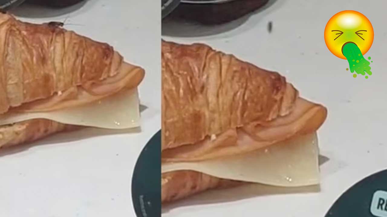 Resulta que la cucaracha está en la vitrina donde ponen los sándwiches y panes; de hecho, está encima de un “Croissant con pechuga y queso”.