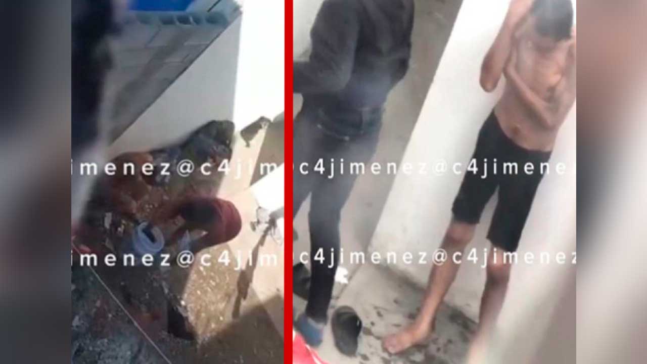 En las imágenes se aprecia que dicho detergente se lo avienta en la cabeza y con un recipiente le echa agua, la cual no se sabe si está caliente o fría, acto seguido el individuo sólo se le alcanza a ver que porta un short negro y en malas condiciones físicas.