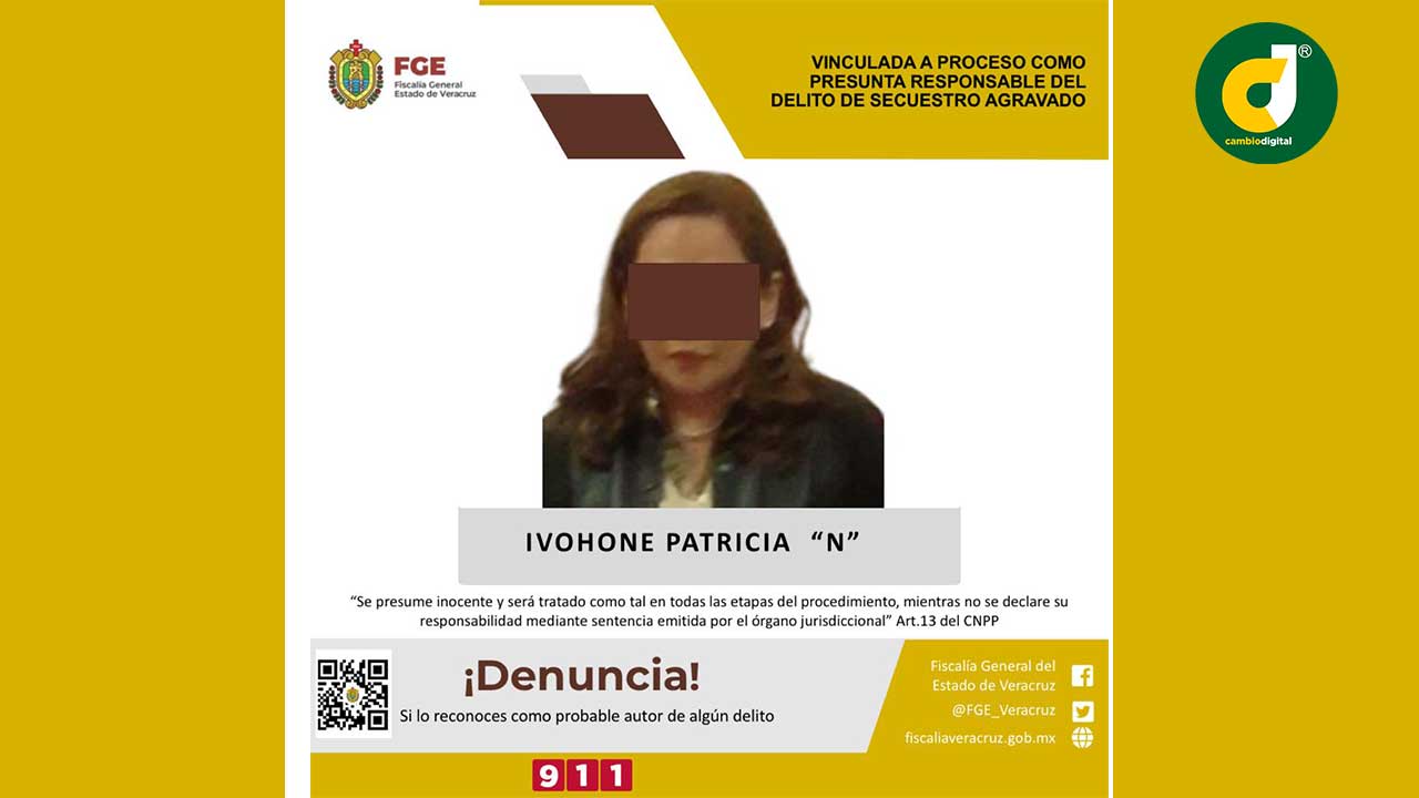 La Fiscalía General del Estado informó que obtuvo vinculación a proceso en contra de Ivohone Patricia “N” como presunta responsable del delito de secuestro agravado, hechos suscitados en Poza Rica el pasado 3 de abril del presente año, en agravio de una víctima de identidad resguardada.