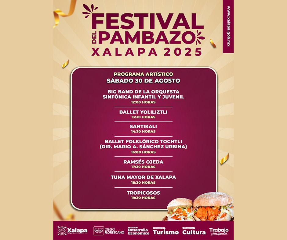 El sábado continúa el Festival del Pambazo con la participación de artistas como la Big Band de la Orquesta Sinfónica Infantil y Juvenil, el ballet Yoliliztli, Santikali, Ballet Folclórico Tochtli, Ramsés Ojeda, la Tuna Mayor de Xalapa y los Tropicosos.