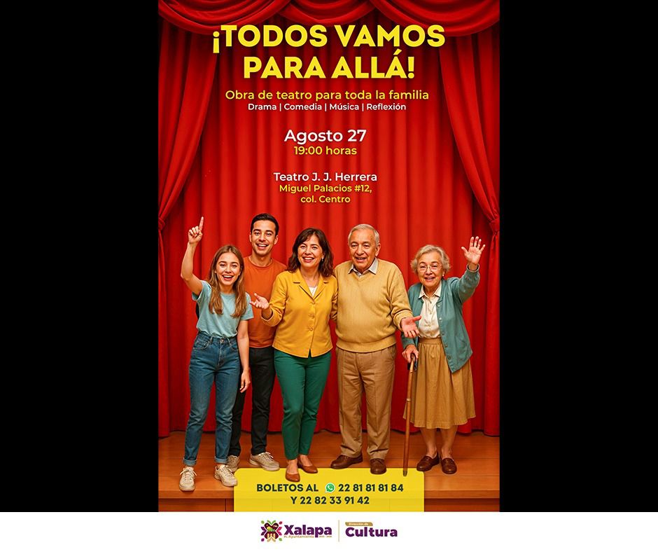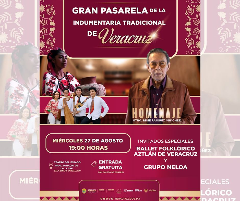 A las 19:00 horas, se presentará la obra “Todos vamos para allá”, en el Teatro J. J. Herrera, así como la pasarela de indumentaria tradicional de Veracruz, en homenaje al maestro René Ramírez Ordóñez, en el Teatro del Estado, con la participación del Ballet Folklórico Aztlán y el grupo Neloa.