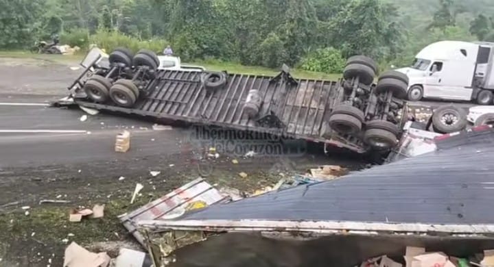Agua Dulce, Ver.- Un accidente vial se registró sobre la carretera Coatzacoalcos–Villahermosa, a la altura del municipio de Agua Dulce, donde un tráiler que transportaba alimentos volcó, provocando afectaciones a la circulación.