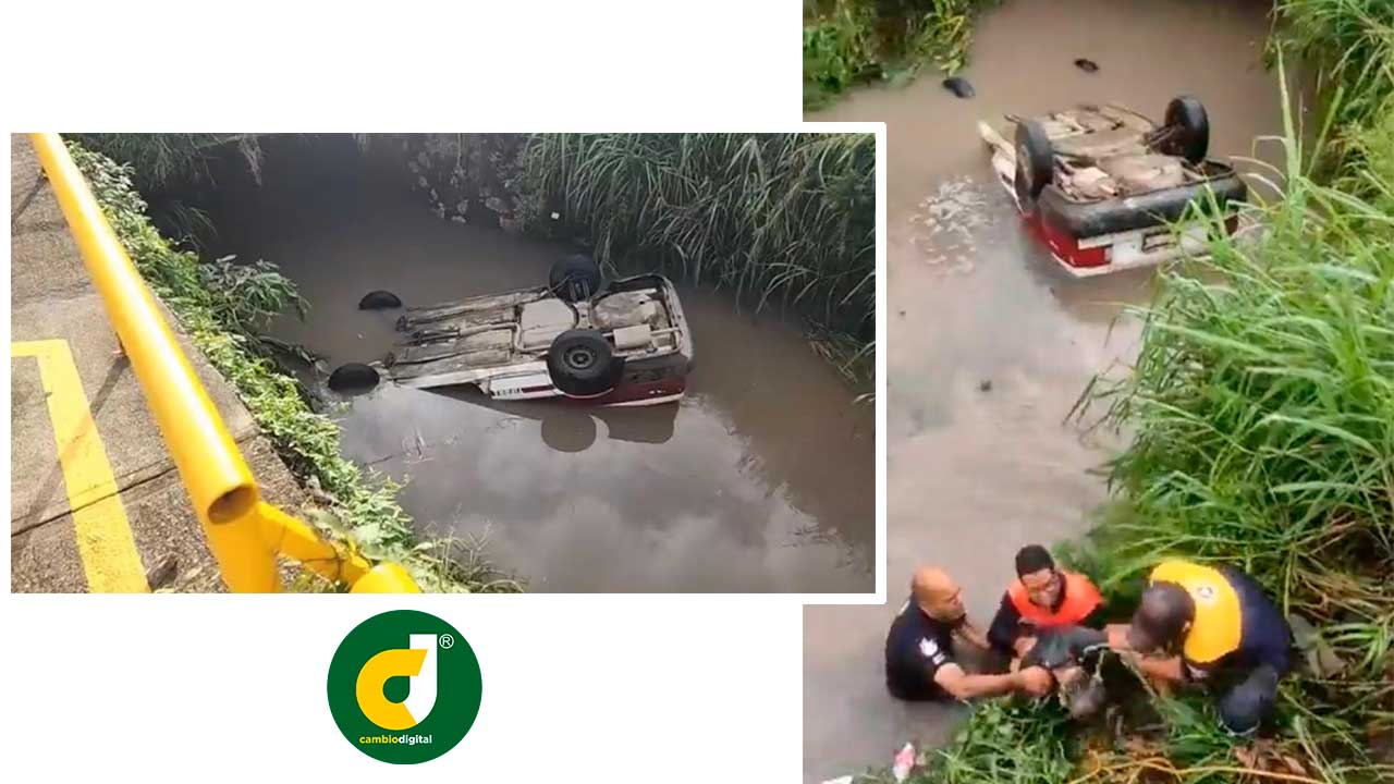 El taxi número económico 318 quedó sumergido llantas para arriba, en el agua que había en la zanja donde se encuentra el puente “Cara Sucia”, de donde salió disparado el taxi.