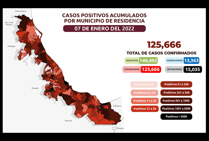 Xalapa, Ver.- Luego de 287 mil 521 estudios practicados, la Secretaría de Salud (SS) ha confirmado 125 mil 666 (+ 376 nuevos) casos de COVID-19 en Veracruz, mil 091 activos y 524 sospechosos actuales.