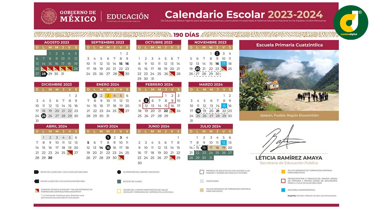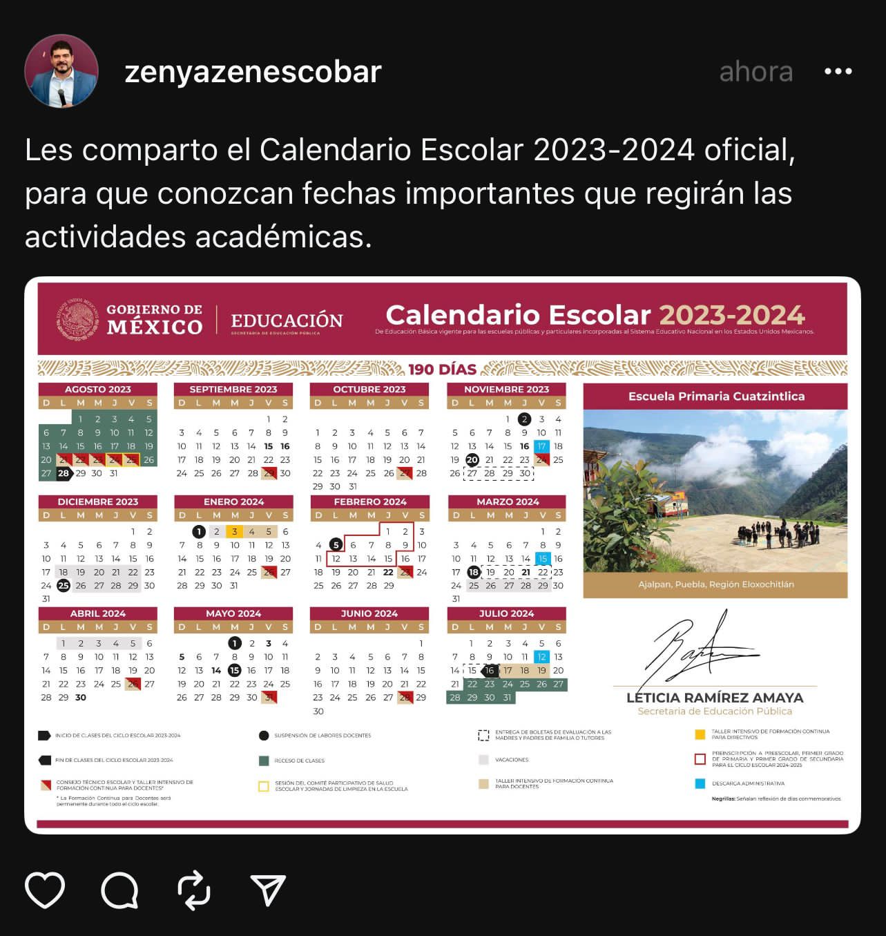 Xalapa, Ver.- El secretario de Educación, Zenyazen Escobar García, compartió en su cuenta de Threads el Calendario Escolar 2023-2024 que difunde la Secretaría de Educación Pública, el cual considera 190 días de clases.
