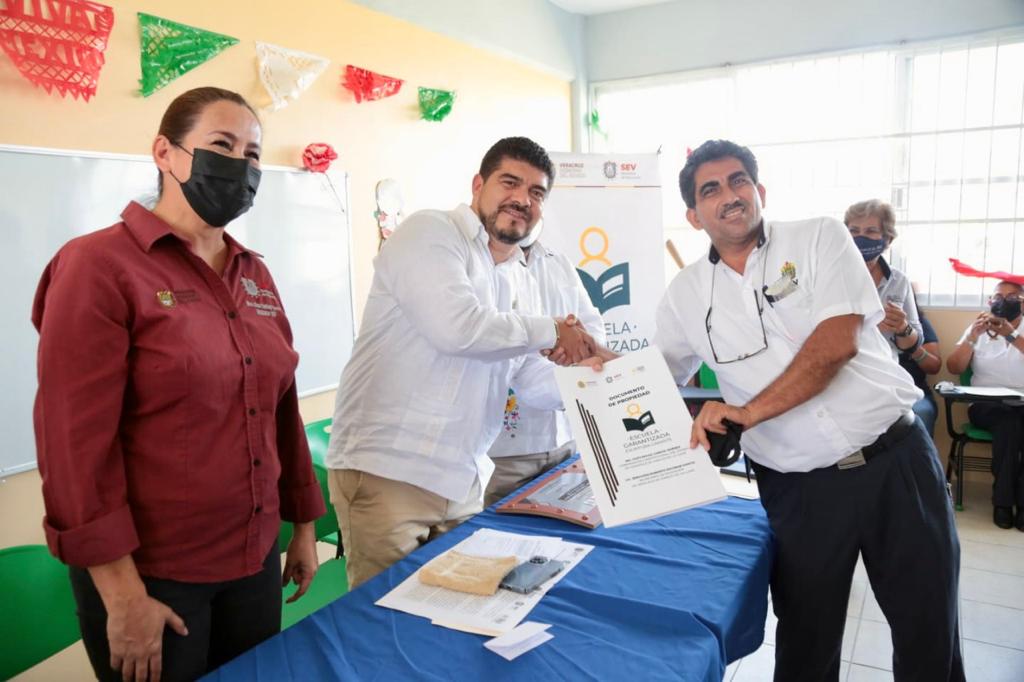 Veracruz, Ver.- Como parte del programa de regularización de predios escolares “Escuela Garantizada, Escritura Garante”, el secretario de Educación de Veracruz, Zenyazen Escobar García, entregó 30 documentos de propiedad a cinco escuelas de nivel preescolar, 19 primarias, tres secundarias y tres bachilleratos, correspondientes a 13 municipios.